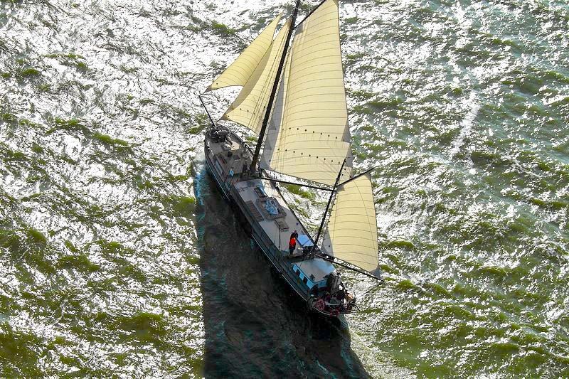 Er is de indruk dat we voort moeten maken, eskaders vinden elkaar snel aan de oostkant van het eiland en ontvangen vervolgens een bericht via Whatsapp van de echtgenoot van de admiraal: ‘Snelheid maken, groeten en naar de haven terug’, i.v.m. de weersvoorspelling en de donkere wolkenpartij. Elk bemanningslid van de deelnemende schepen doet waanzinnig zijn/haar best om in frontlinie aan te komen varen en tegelijk de fok te laten zakken incl. het zwaaien, om vervolgens op commando de fok weer in één beweging gezamenlijk te hijsen.