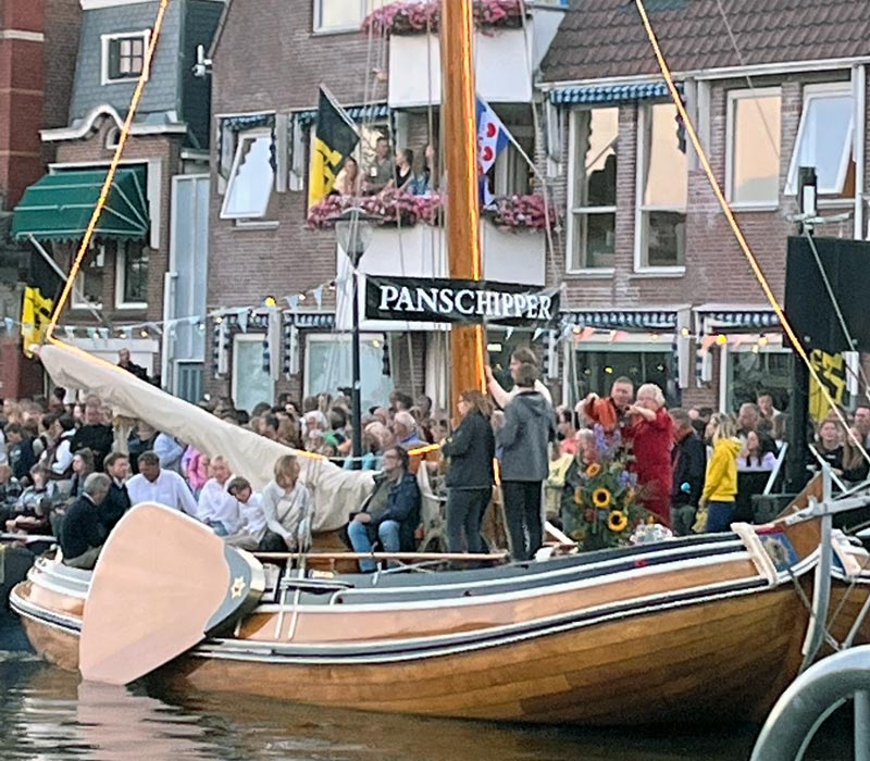 Zondag was er een prettig briesje over de lengte van de Grote Plas. Het was de dag van het admiraalzeilen. Tijdens het pallaver werd uitgelegd wat er van iedereen werd verwacht. De tijdelijke commandant van de admiraal, dhr. Van Waning, was al aanwezig en deelde zijn adviezen met de eskaderleiders. Een leuk detail: dhr. Van Waning is de zoon van een mede-oprichter van de SSRP! Samen met de Aalsmeerder loco-burgemeester Robert van Rijn als admiraal beoordeelden zij de prestaties van de eskaders en de groet aan de admiraal. ‘De Bever’ was dit jaar het admiraalschip en lag geankerd op de Grote Plas. De eskaders voeren in kiel- en frontlinie langs en gaven met hun fok de groet. De eerste prijs ging naar het eskader Aken (Sijtje, Bosche Bol, Zulthe).