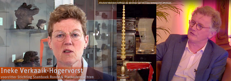 Het digitaal overhandigen van de Van Waningprijs 2021 betekende het inzoomen op het belang van de wisselprijs en zijn doelstelling, daarnaast het inzoomen op de fysieke prijs (tuigje met de prachtig handgesneden mastwortel, door Heit Piersma, incl. het blok waarop in de zilveren plaquettes de gegraveerde namen van de prijswinnaars zichtbaar zijn) en het bijbehorende certificaat. De originele Van Waningwisselprijs is door Meindert tentoongesteld in de vitrine ’Scheepssier’ en de glazen Van Waning-award neemt Meindert mee naar zijn nieuwe werkruimte in Historisch Centrum Leeuwarden.